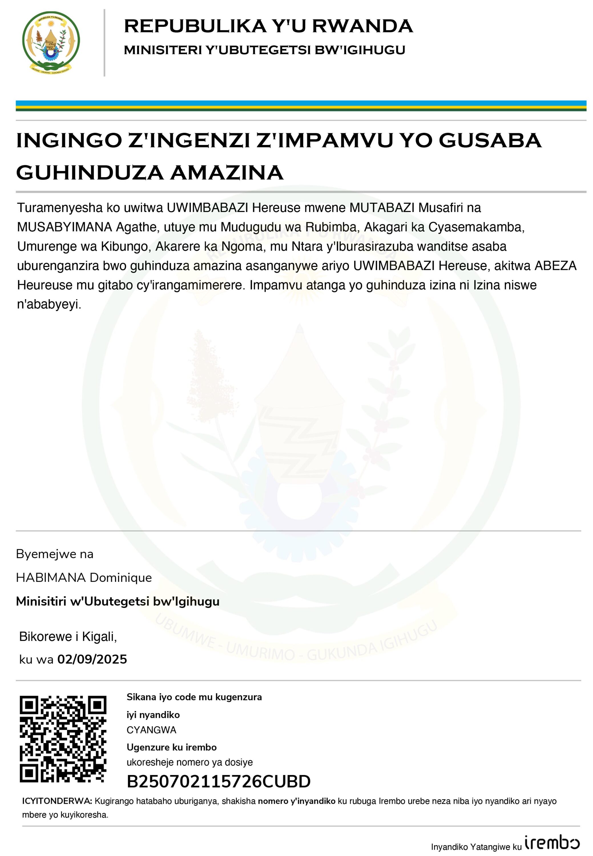 ITANGAZO RYO GUHINDURA IZINA AKITWA ABEZA Heureuse